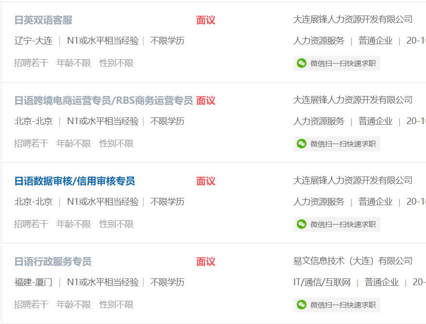 從日語人才網(wǎng)https://www.japanhr.com/job/ 上可以看出,國內(nèi)的日企招聘日語人才時,大多數(shù)的要求是日語N1以上。