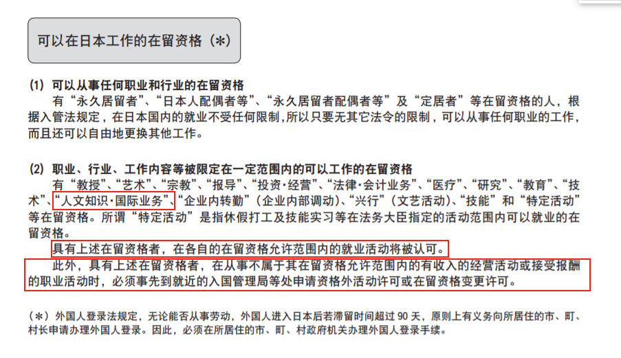 具有“人文知識?國際業(yè)務(wù)”在留資格者,在在留資格允許范圍內(nèi)的就業(yè)活動將被認(rèn)可。