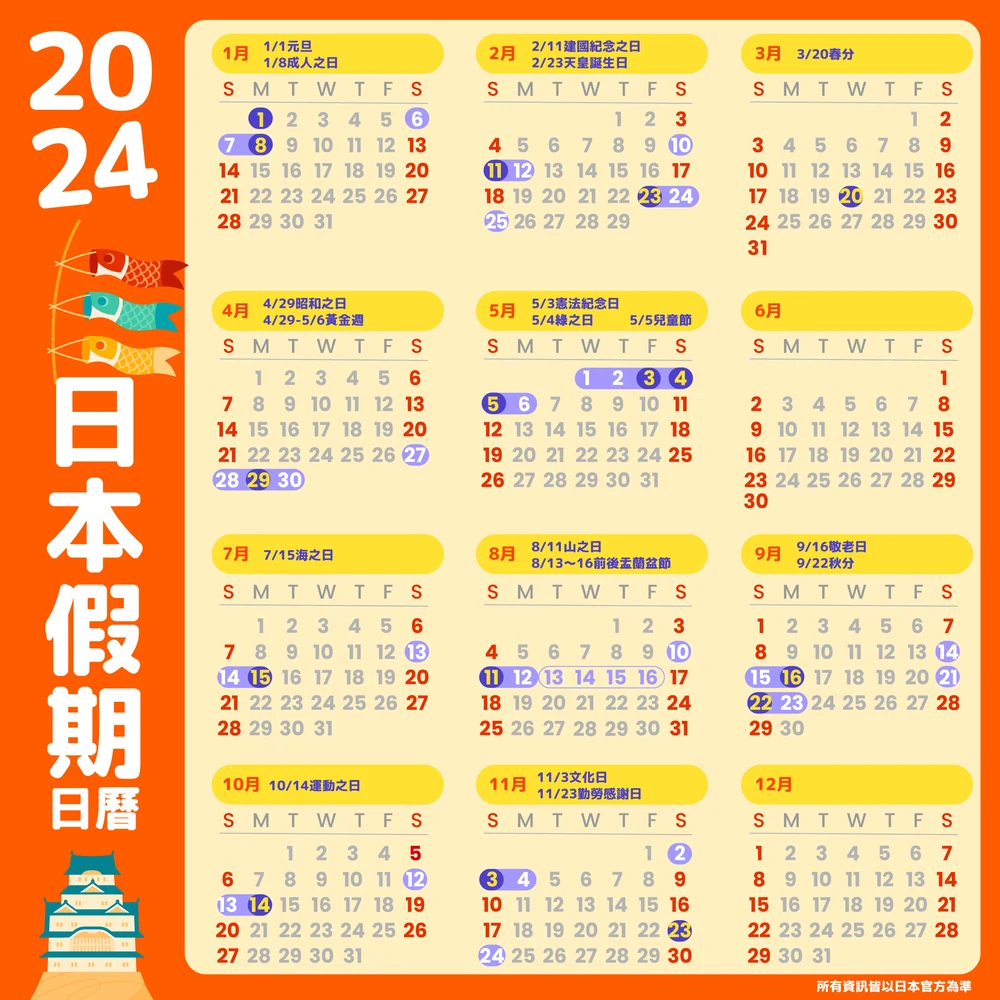 【 2024年的日本3日以上連休假期】