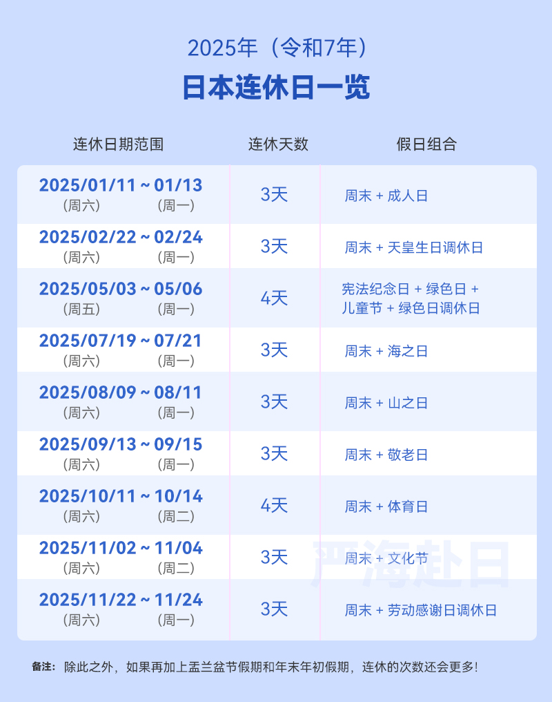 日歷上如果有好幾個(gè)紅日子相連,或者碰到周末,就會(huì)構(gòu)成一個(gè)連休,日本的法定節(jié)假日相對(duì)較多,每個(gè)月的平均休息時(shí)間大部分都在十天以上!下面就一起看看2025年日本有哪些節(jié)假日吧!