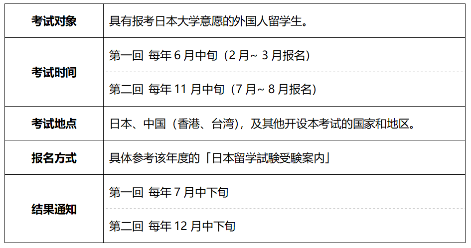主要面向希望入學日本大學或是專門學校的外國人留學生 , 用來評測來日留學生的日本語能力和基本學力為目的建立,完全可以理解為日本的留學生高考。