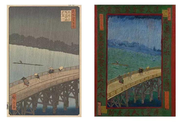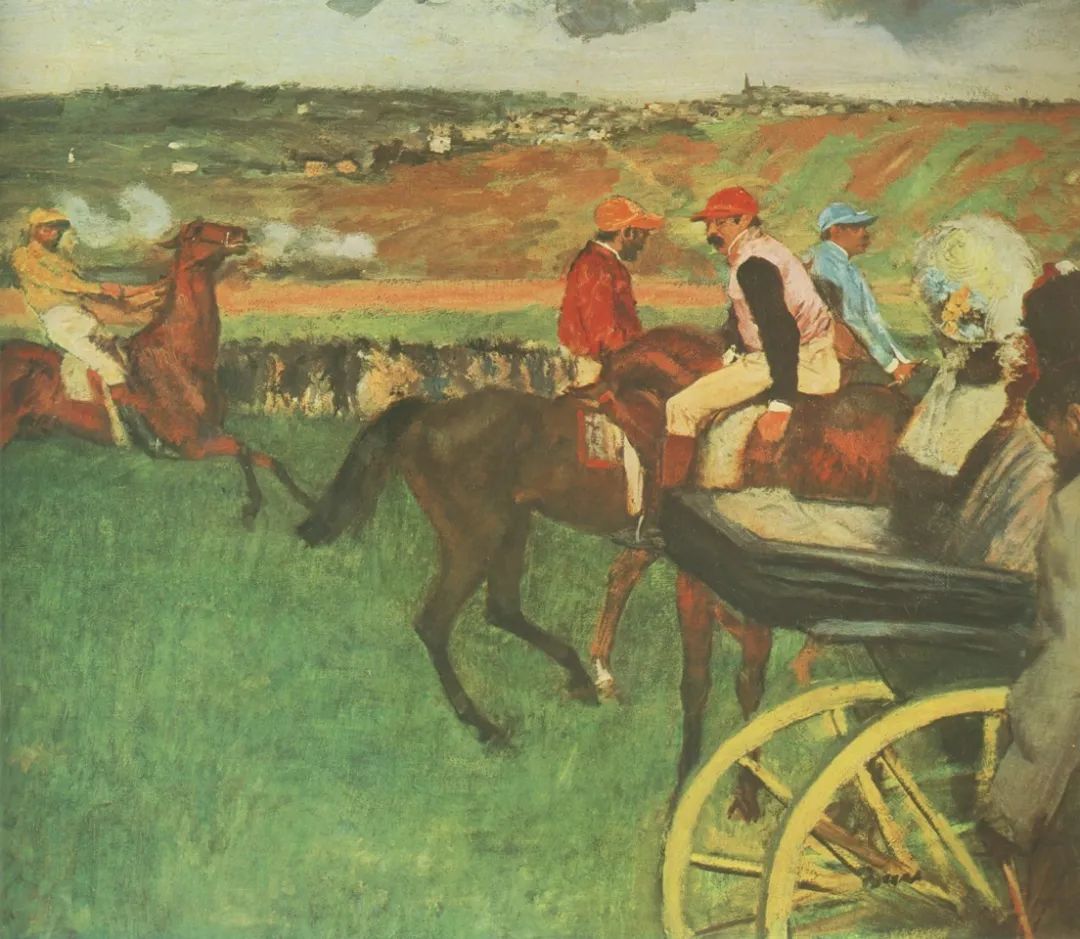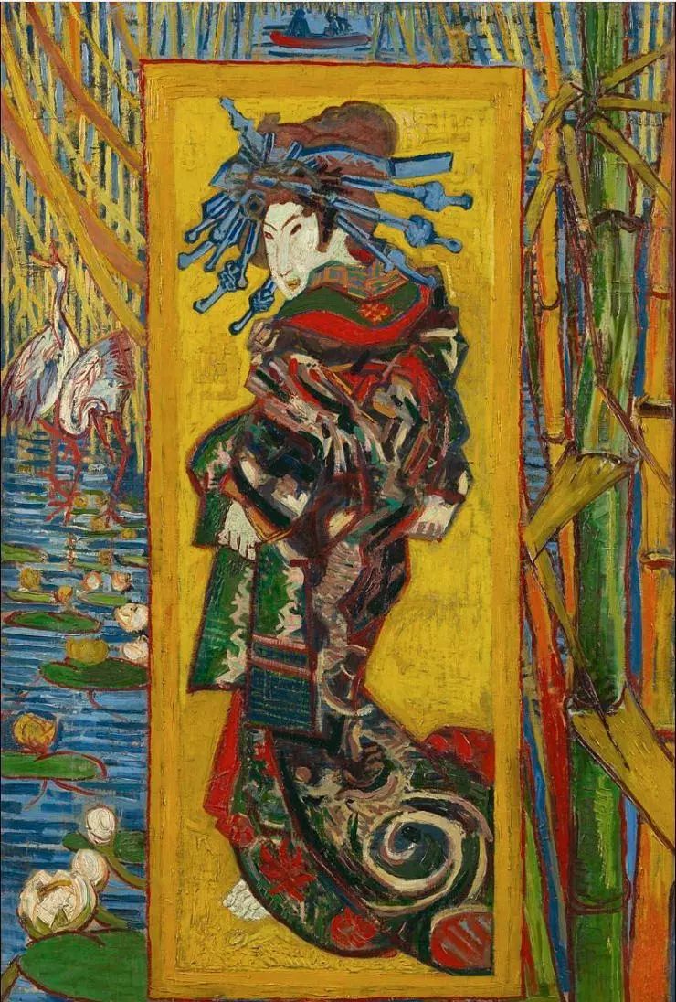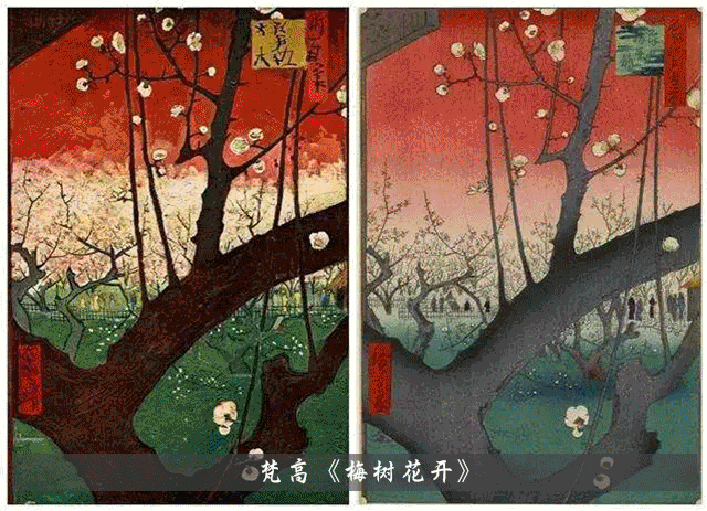 莫奈以妻子為模特的作品當(dāng)然,歐洲人是單純被畫面吸引,因此誕生出不少東西合璧的作品。浮世繪因?yàn)槭芟抻跈C(jī)器和材料,超大幅版畫需要拼接完成。這樣歐洲人就看到不少不完整的畫面,殘缺的構(gòu)圖反而被一些印象派、后印象派畫家當(dāng)做你沒見過的“全新構(gòu)圖方式”進(jìn)行創(chuàng)作。德加《賽馬會(huì)上》 1877—1880年 奧賽博物館藏再比如狂熱的浮世繪愛好者梵高,拿油畫顏料臨摹了歌川廣重的《龜戶梅屋》,然后他恭恭敬敬地把邊上的日文也寫上了,估計(jì)他完全沒意識(shí)到這其實(shí)是一張廣告,左右的日文是名字和地址——臨摹了一張煙花柳巷的傳單。梵高《開花的梅樹》(右)上日文為 龜戶梅屋,吉原區(qū)一家花花酒館的宣傳