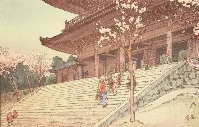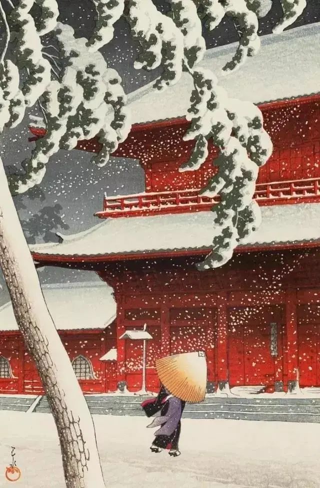 《佐佐寺的雪》—川瀬巴水明治維新后,大量西洋畫涌入日本,在全盤歐化的風(fēng)氣下,日本畫家開始學(xué)習(xí)西方繪畫,屬于江戶時(shí)代的浮世繪就此沒落。但它的奇妙旅程還在繼續(xù),20世紀(jì)初,不少畫家以浮世繪的材料與技法,創(chuàng)造出融合西方風(fēng)格的新浮世繪,這些作品被稱為“新版畫運(yùn)動(dòng)”,是帶著印象派光影和透視的浮世繪,代表人物有川瀬巴水和吉田博。