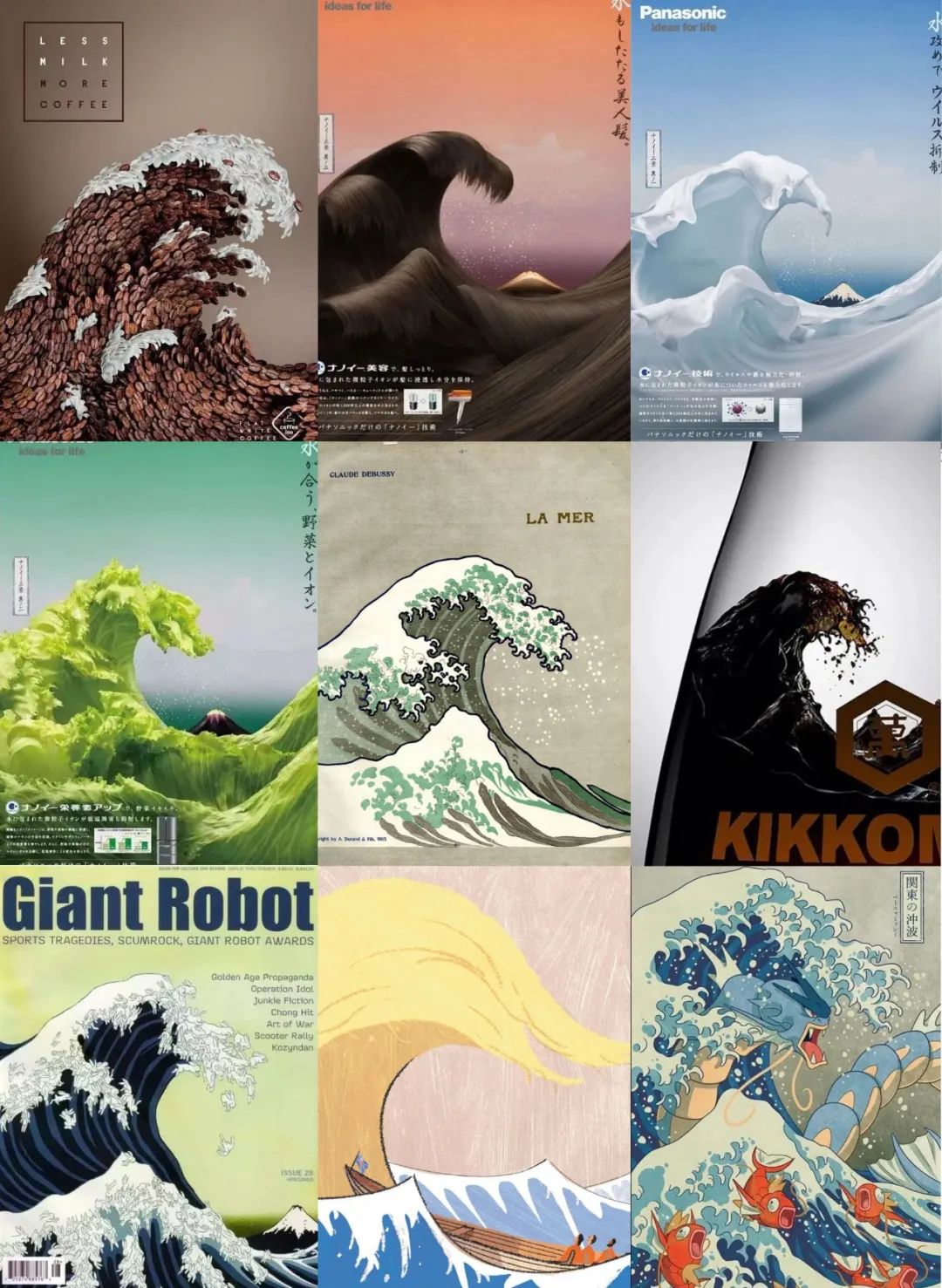 再放眼世界范圍,對(duì)這張畫的魔改可以用“無數(shù)”來形容。從咖啡豆到牛奶、生菜,甚至是神奇寶貝和川普的頭發(fā)都能化身《神奈川沖浪里》。