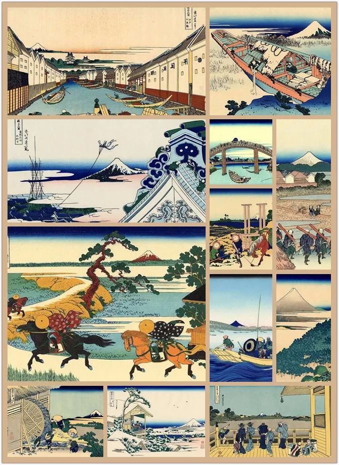 實(shí)際上,《神奈川沖浪里》這張畫,只是《富岳三十六景》中的一張。《富岳三十六景》這批畫當(dāng)年足足印了有至少8000張,每張定價(jià)為16文、平民百姓兩碗面的價(jià)格,跟我們路邊小傳單、隨手貼墻上的海報(bào)一樣平凡。畫家葛飾北齋創(chuàng)作這批畫,也純粹是為了賺錢謀生。這位窮了一輩子的大師,想用日本對(duì)富士山的崇拜追個(gè)熱點(diǎn),所以在這一系列的每張畫里,你都能看到一個(gè)或大或小的富士山。