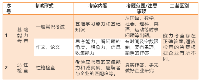 日企的筆試一般分為以下幾種,一般從學(xué)習(xí)能力和性格上對(duì)面試者進(jìn)行測試,根據(jù)企業(yè)選人要求不同,需要參加的考試種類也有所變化。