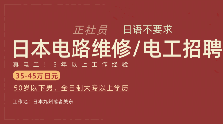 日本電路維修電工招聘真電工招聘!3年以上經(jīng)驗,要有施工現(xiàn)場,工廠鋪線的經(jīng)驗。維修機器:(如:色選機、靜電機、水洗機、造粒機、粉碎機)年齡:50歲以內(nèi),全日制大專以上學(xué)歷,有三年以上電工工作經(jīng)驗,日語不要求。