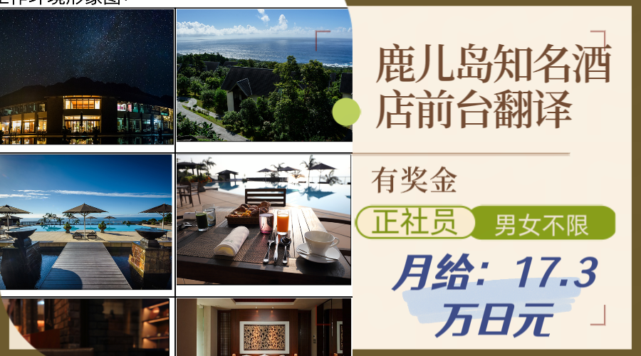 工作內(nèi)容:酒店前臺翻譯,辦理入住,退房手續(xù),電話對應,酒店內(nèi)設(shè)施介紹引導等工作。